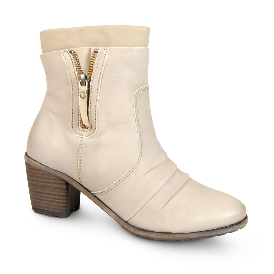 Материал верха: натуральная кожа. Материал подкладки: текстиль. Высота каблука ок. 6,5 см. Ботильоны для тех, кто ищет красоту и комфорт. Бежевый цвет, декоративная молния на голени, интересное решение в верхней части, стильные защипы на подъёме. Кроме всего - удобная колодка и широкий каблук - в такой обуви Вам будет легко и комфортно.