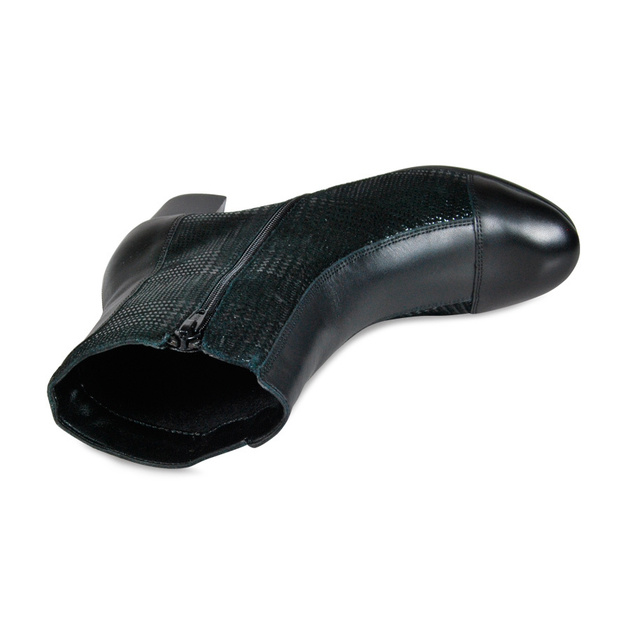Изящные стильные ботильоны выполнены в сочетании гладкой натуральной кожи и велюра классического черного цвета. Модель имеет застежку- молнию с внутренней стороны, внутри утеплена шерстью. Такая модель станет отличным дополнением Вашего образа.