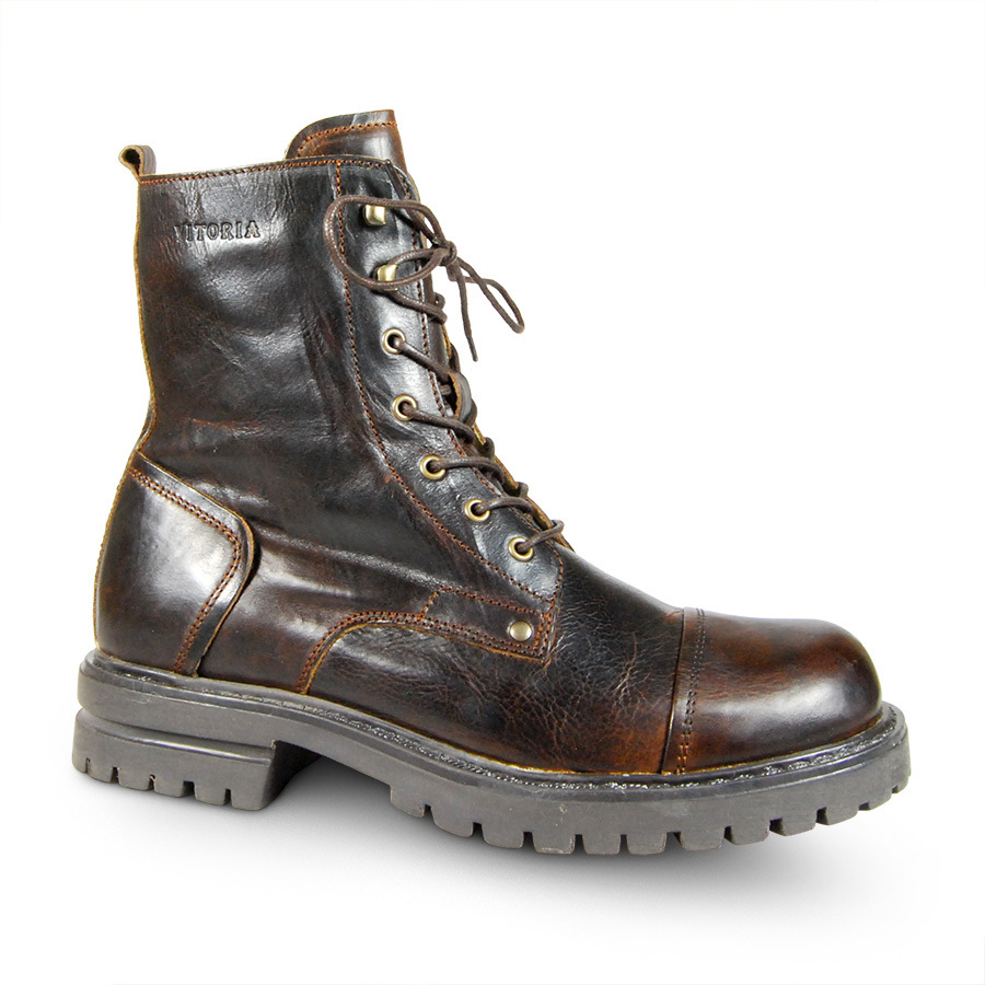 Прочные ботинки, стилизованные под милитари. Высокое голенище, толстая подошва долго сохраняют тепло. Высокая шнуровка плотно удерживает ногу. Глубокий протектор на подошве предотвращает скольжение. Жесткий мысок и пятка хорошо держат форму. Материал верха: натуральная кожа. Материал подкладки: натуральная шерсть.