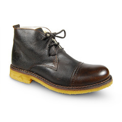 Ботинки современного дизайна. Материал верха: натуральная кожа. Материал подкладки: натуральная шерсть. Двойная прошивка обеспечивает долговечность модели. Вспененная подошва дарит чувство легкости при ходьбе. Сочетание коричневого цвета ботинок с желтой подошвой делает эту модель заметной.