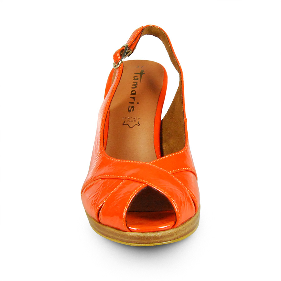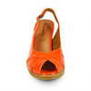 Стильные босоножки на каблуке жизнерадостного оранжевого цвета. Высота каблука ок. 9 см компенсируется наличием небольшой платформы. Модель фиксируется ремешком через пятку.