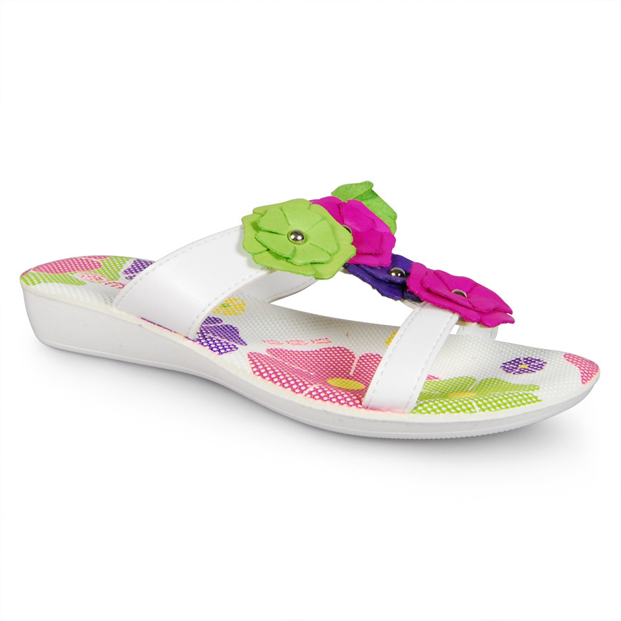 Красивая летняя модель. Украшена разноцветными цветками. В такой обуви легко и комфортно в жаркие летние дни.
