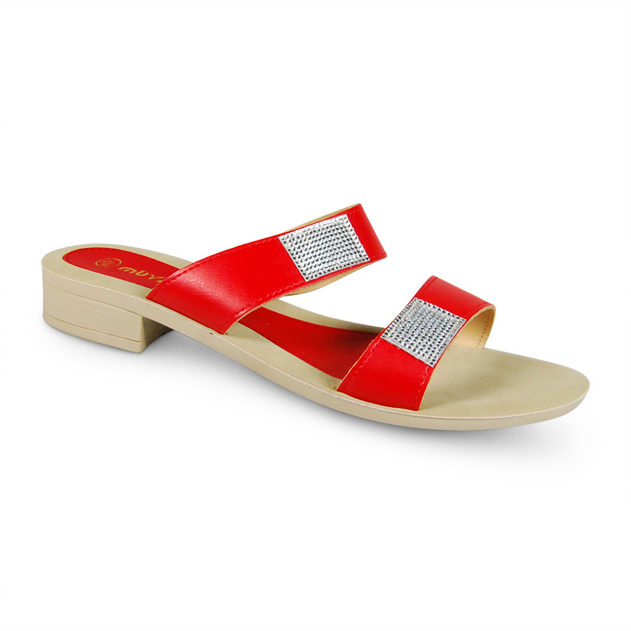 Женские шлепанцы на невысоком каблуке. Верх из искусственной кожи дополнен сверкающими украшениями. Яркий и комфортный вариант для повседневного ношения.