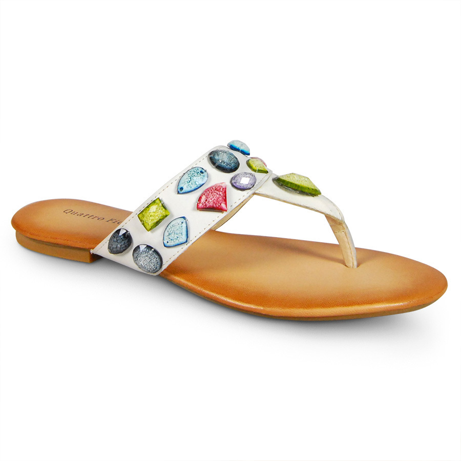 Женские пантолеты с фиксацией между пальцев. Выполнены из натуральной кожи. Модель декорирована разношветными камнями, что придает ей особый колорит. Идеальный вариант для пляжного отдыха.