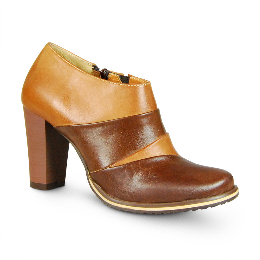 Стильные туфли на высоком, но устойчивом каблуке. Полностью выполнены из натуральной кожи. Модель отличается красивым комбинированием светло-коричневого и темно-коричневого цветов. Для удобства туфли снабжены застежкой-молнией и эластичной вставкой сбоку.