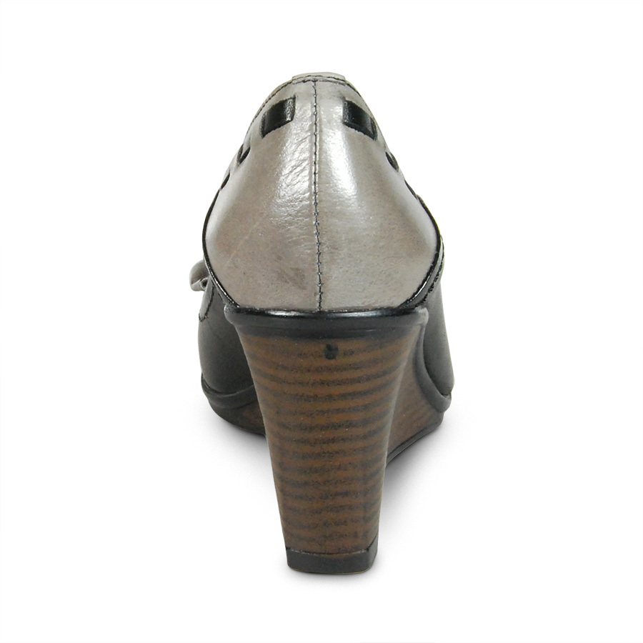 Красивые туфли на комфортной танкетке. Оформлены крупным декоративным бантом спереди, который придает модели особый шарм. Серая вставка в пяточной части дополнена прошивкой кожаным шнуром контрастного цвета.