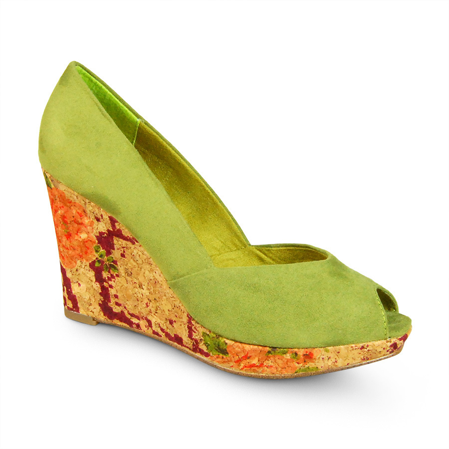 Материал верха: искусственная замша. Оригинальная и интересная модель туфель с открытым мысом. Красивый цвет зеленого яблока. Расписная пробковая танкетка высотой ок. 9,5 см. В этих туфлях элегантность образа Вам будет обеспечена.