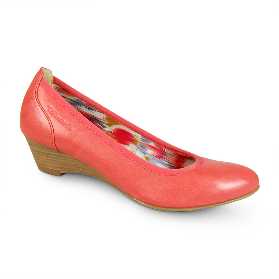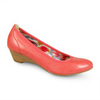 Красивые туфли на каблуке, перходящем в танкетку. Высота каблука ок. 4 см. Актуальный в этом сезоне коралловый цвет. Удобная колодка, лаконичный дизайн, четкие формы.