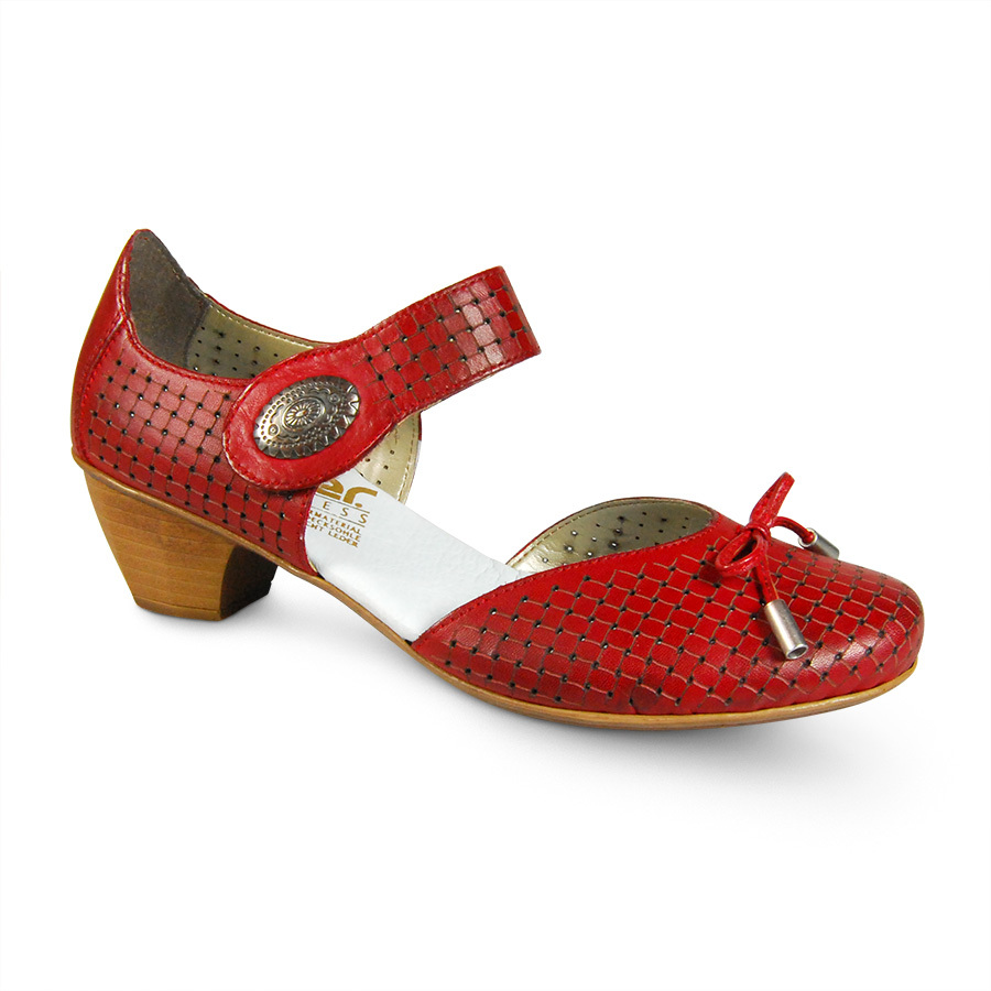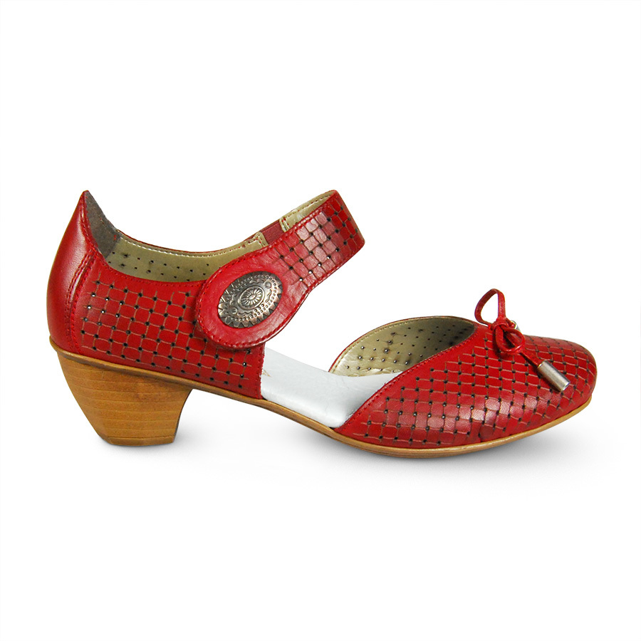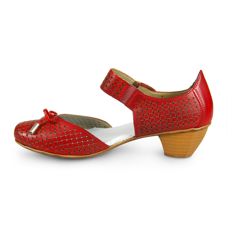 Летние туфли из перфорированной кожи красного цвета, удобный широкий каблук, мягкая перепонка на липучке. Комфортная и актуальная модель.