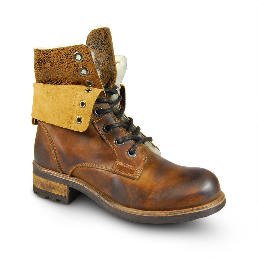 Высокие ботинки из натуральной кожи с натуральным шерстяным утеплителем. Эффектный двойной отворот позволяет сочетать варианты ношения. Жесткий мысок и пятка прекрасно держат форму. Высокая шнуровка хорошо удерживает ногу. Гибкая подошва не скользит и не стирается.