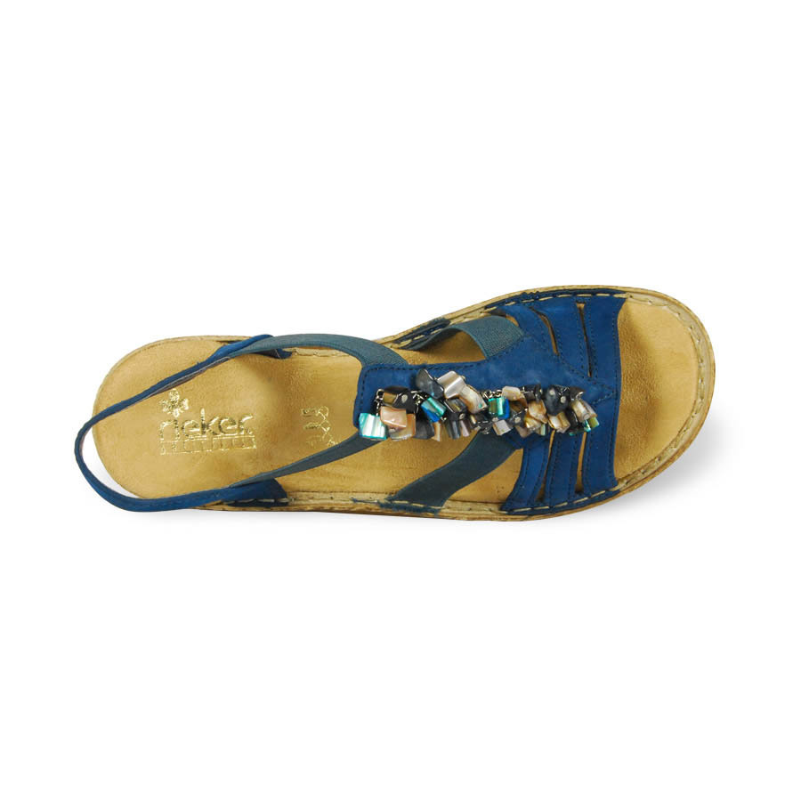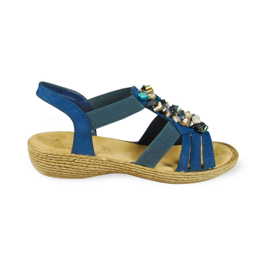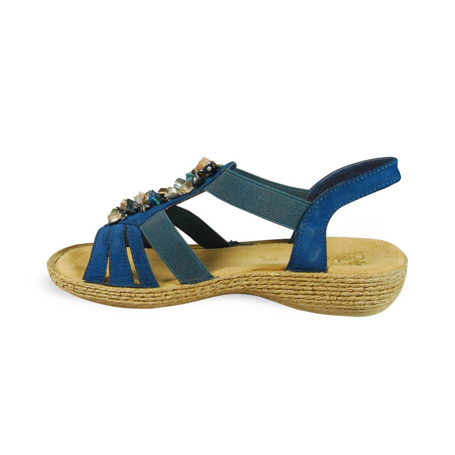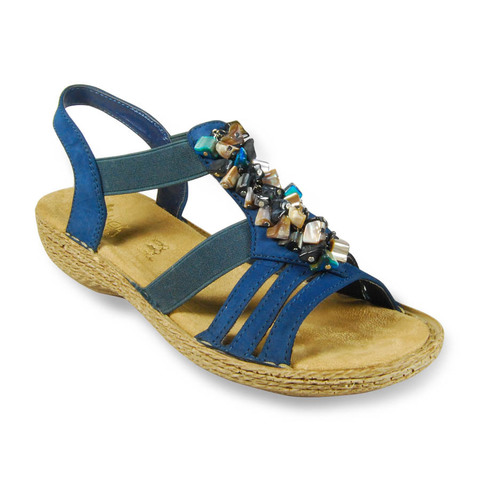 Удобные сандалии на танкетке. Материал верха и подкладки: искусственная кожа. Ремешки придают изящность модели. Верх украшен декоративными камнями.